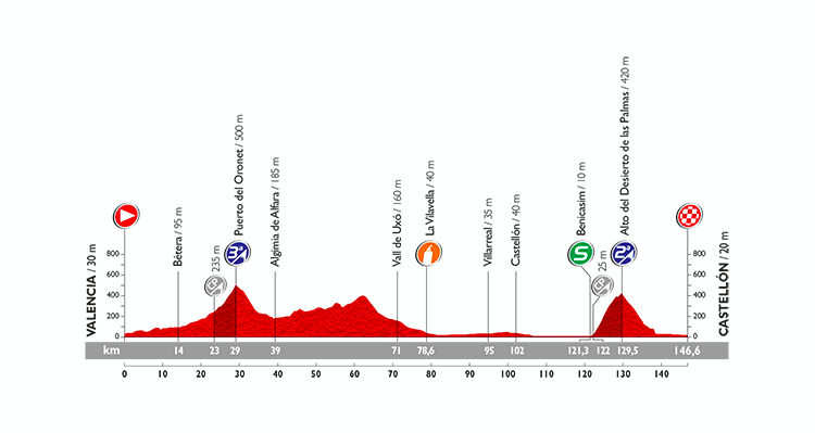 The stage opens with a gentle uphill drag into the first categorized climb, a relatively uncomplicated Cat. 3, the Puerto del Oronet. Then comes a descent, a long false flat, and another descent into a 40km stretch of pan-flat roads.