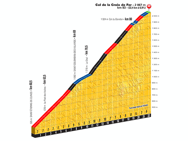 22.4km at 6.9%, the Croix de Fer is a huge challenge to overcome, with a particularly steep midsection that jumps into double digits for a little while.
