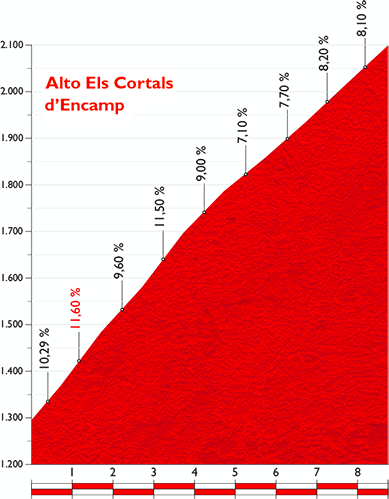 The Alto Els Cortals d’Encamp is a pretty regular climb—but it’s 8.7km at an average of 9.1%. Taking on two climbs of over 9% in such quick succession after such a tough day will probably see several big names see their GC campaigns go up in flames—there is just no way that everyone makes it up super-steep gradients unscathed.