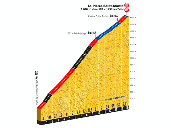 That final climb will be the hardest uphill test so far in this Tour de France. La Pierre-Saint-Martin is a 15.3-kilometer ascent at an average gradient of 7.4%. The most difficult section comes about half-way through, a 4km stretch at over 9%. Then things ease off a bit, before another quick steep section near the summit, where things even out again close to the line.