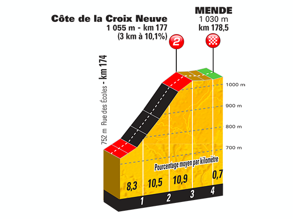 Before the riders reach the Stage 14 finish line in Mende, they’ll have to overcome the steep Côte de la Croix Neuve. Anyone feeling a bit below 100% will be found out quickly on the double-digit gradient.