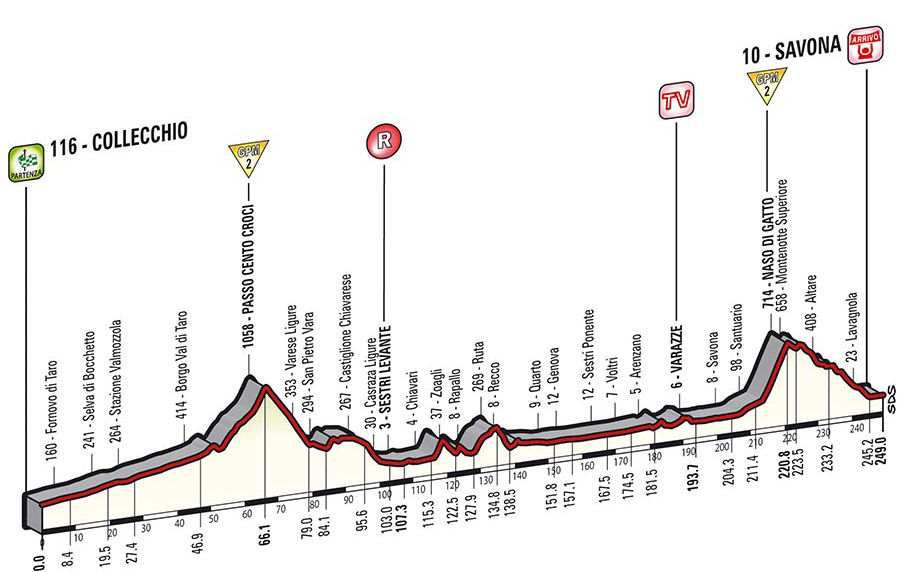 Purito wasn’t the only rider who abandoned in the wake of the crash-marred sixth stage (the list of abandons includes Purito’s teammates Angel Vicioso and Giampaolo Caruso, who are both out after suffering nasty injuries as well), so it will be a somewhat smaller peloton that sets out from Frosinone in Stage 7. There are a number of bumps along the road to Foligno, but none of them are particularly challenging, and the last one is crested with 40 km still to go on the day. Breakers will surely take their chances, but with a long, flat run to finish line, the sprinters’ teams should make a strong effort to pull back anyone who gets too far up the road. A breakaway victory is certainly possible, but I think a bunch sprint is the more likely outcome. Whatever the size of the lead group entering town, a nasty hairpin with about 1.5 km remaining will make for a fierce fight to get into position early, but the final kilometer that follows is not as technical as some we’ve seen so far; there is a gentle right turn with around 500 meters to go, but it shouldn’t slow down the riders too much. I don’t think the profile will be too much for any of the major sprinter names to handle, so after two days of finishes open to a considerably more versatile cast of contenders, I think we’ll see the familiar top-flight fastmen battling it out in the finale.