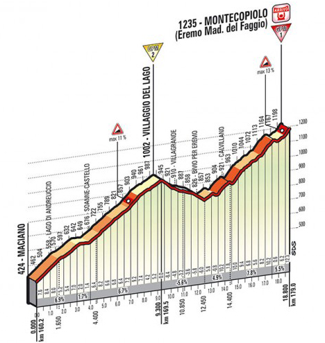 Astana’s Enrico Gasparotto has hit a lot of misfortune in this Giro, going down in the rainy opening stages on more than one occasion. This long, undulating parcours with a short but steep climb towards the end is reminiscent of the classics, where Gasparotto has had success in his career. This could be a day for him to try to make the breakaway. Neri-Sottoli’s Simone Ponzi and Mauro Finetto have similar skillsets and could also make a bid to get out front. Cannondale has Moreno Moser, Daniele Ratto, and Oscar Gatto for this sort of contest. Stefano Pirazzi’s Bardiani – CSF teammate Enrico Battaglin is another rider with good climbing legs and a nice kick, and he could be a nice bet. The same is true for Julian Arredondo’s Trek teammate Fabio Felline. Lotto Belisol’s Adam Hansen loves grueling stages that will put the endurance of his breakaway companions to the test, while teammate Tim Wellens is an aggressive, versatile rider with a fast finish who is targeting stages and possibly even mountain points. Katusha’s Luca Paolini has the classics background for a long day of rolling hills. Stage 9 winner Pieter Weening of Orica-GreenEdge might be able to hang tough out front on this profile. Sky’s Dario Cataldo also has the endurance and won’t be troubled by the climbs. Team Colombia has numerous options in Fabio Duarte, Robinson Chalapud, and Miguel Angel Rubiano. Garmin-Sharp’s Nathan Haas was suffering after-effects of a crash in a pair of earlier stages that looked to suit him but he seems to be back on form now, and could target this one. Former GC hopefuls like Tinkoff-Saxo’s Nicolas Roche, Katusha’s Daniel Moreno and Lampre’s Damiano Cunego could find the finale suits them.