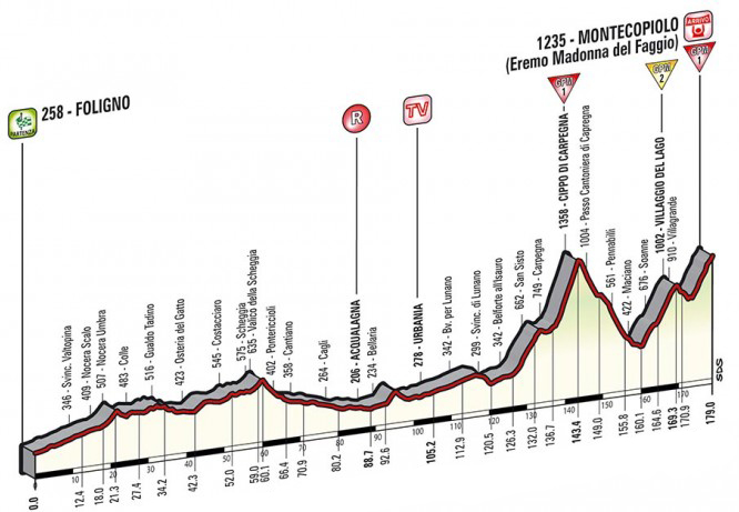 Coming in such quick succession, the already difficult climbs will inject serious pain into the legs of anyone who isn’t at full strength. The ascent up the Cippo di Carpegna, which averages nearly 10%, will wear on even the best climbers, but following it up with an irregular climb up to the finish at Montecopiolo practically guarantees that gaps will start to form. Even if a small group manages to hold it together at the front most of the way up, the final few hundred meters of racing kick up to 13%, which should force some separation as the very lightest climbers jump for the finish.