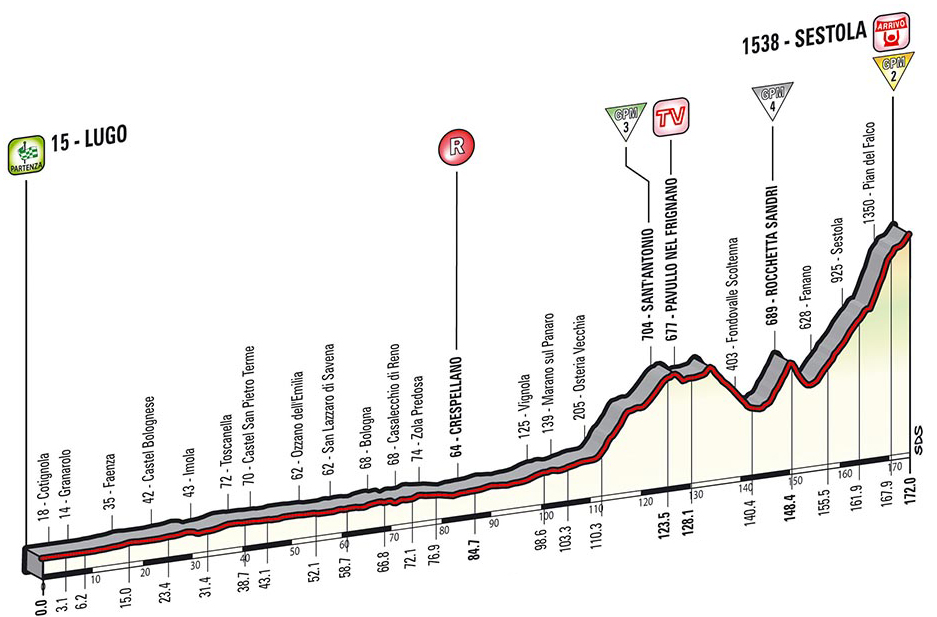 Another mountain test awaits the peloton on the Giro d’Italia’s ninth stage. The big names will all be at least a bit winded after a tough day: the GC riders put in some high pace on the climbs of Stage 8 to reel in the last survivor of the early breakaway, Julian Arredondo, in the final minutes, and then Diego Ulissi put in an impressive uphill charge for the stage victory. The first 110 kilometers of Sunday’s ninth stage are quite flat, but then the road kicks up leading into a trio of Categorized climbs: a Cat. 3, a Cat. 4, and then a long Cat. 2 ascent to the finish at Sestola. The first two lumps will take a bit out of the riders, but it’s the final climb that will do most of the hurting. 16.5 kilometers in total, it’s an irregular ascent that starts out with 8.5 km at a little under 5%, then jumps up to almost 9% (with a section of 13%) for 4 kilometers or so, and then eases off to 4.5% over the final few kilometers. The long first section, even at a less-than-fearsome gradient, will be a challenge after the peloton has already been riding skyward for so long. Whoever is at the front, the strongest climbers among the group should be able to hang on, but the attacks could come fast and furious in the very steep section that follows. If a lead group of riders makes it through to the gentler gradients near the top, a strong sprint will be useful in taking the day.