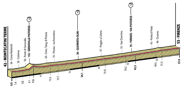 One thing everyone can agree on about this profile: it’s grueling. This race will be won by a true hardman. 272.2 km of ascending and descending, and the favorites will face all the adversity that comes with every other rider on the road dreaming of this one day being his big day for a legendary winning move. The first half is not particularly challenging, a 100 kilometer prelude with a pair of climbs (Montecarlo and San Baronto) to put a bit of fatigue in the legs before the riders begin their ten laps around the Florence circuit. Every trip around town will include a climb up the Fiesole (4.4 km at 5.2%) and the short but steep Via Salviata (0.6 km at 10.2%), summited with 5 kilometers to go. There is also a bump in the road 3.5 kilometers from the end of the loop of less than a kilometer, but it’s got a section at 10%. Going up and down so many times adds up to quite a quantity of vertical meters; but it will have to be this repeated suffering that takes its toll, as a single climb up the Fiesole wouldn’t be particularly selective. More importantly, the top of the Fiesole is more than 10 km from the end, and the short Via Salviati and shorter mini-ramp a few km later are the only real lumps in an otherwise downhill or flat run-in. In other words, it will be a big challenge to attack on the climbs with so much space for the peloton to catch back up. With a flat finish, the winner will likely need a sprint.
