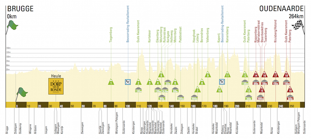 At 264 kilometers, the Tour of Flanders is a long one, and the arduous journey gets more and more difficult as the day wears on. The peloton will set out from scenic Bruges and head south towards the cobbled climbs that this race has made so famous. The route contains seventeen officially classified climbs this year, many of them repeat trips up the same ascents, as the course starts looping into itself and covering the same ground again for multiple visits to these famous hellingen.